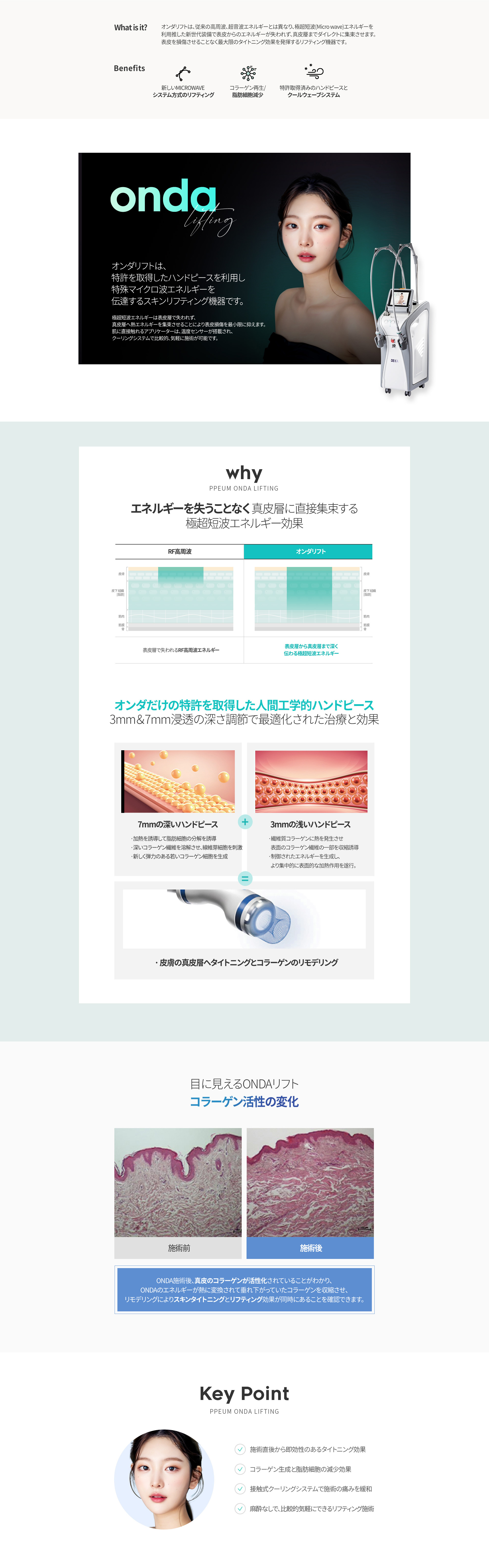 - 従来の高周波、超音波を利用したレーザーリフティング機器とは異なり、極超短波マイクロウェーブエネルギーを利用し、